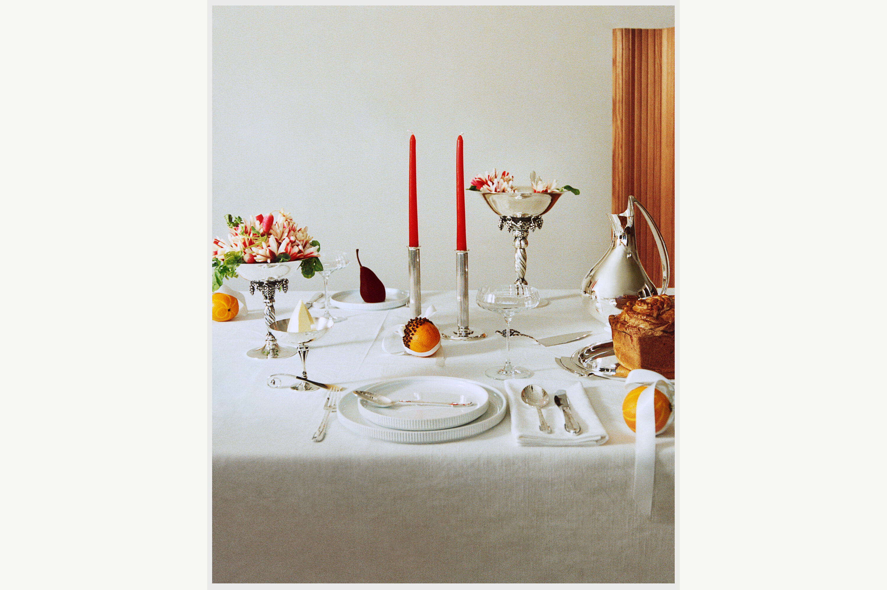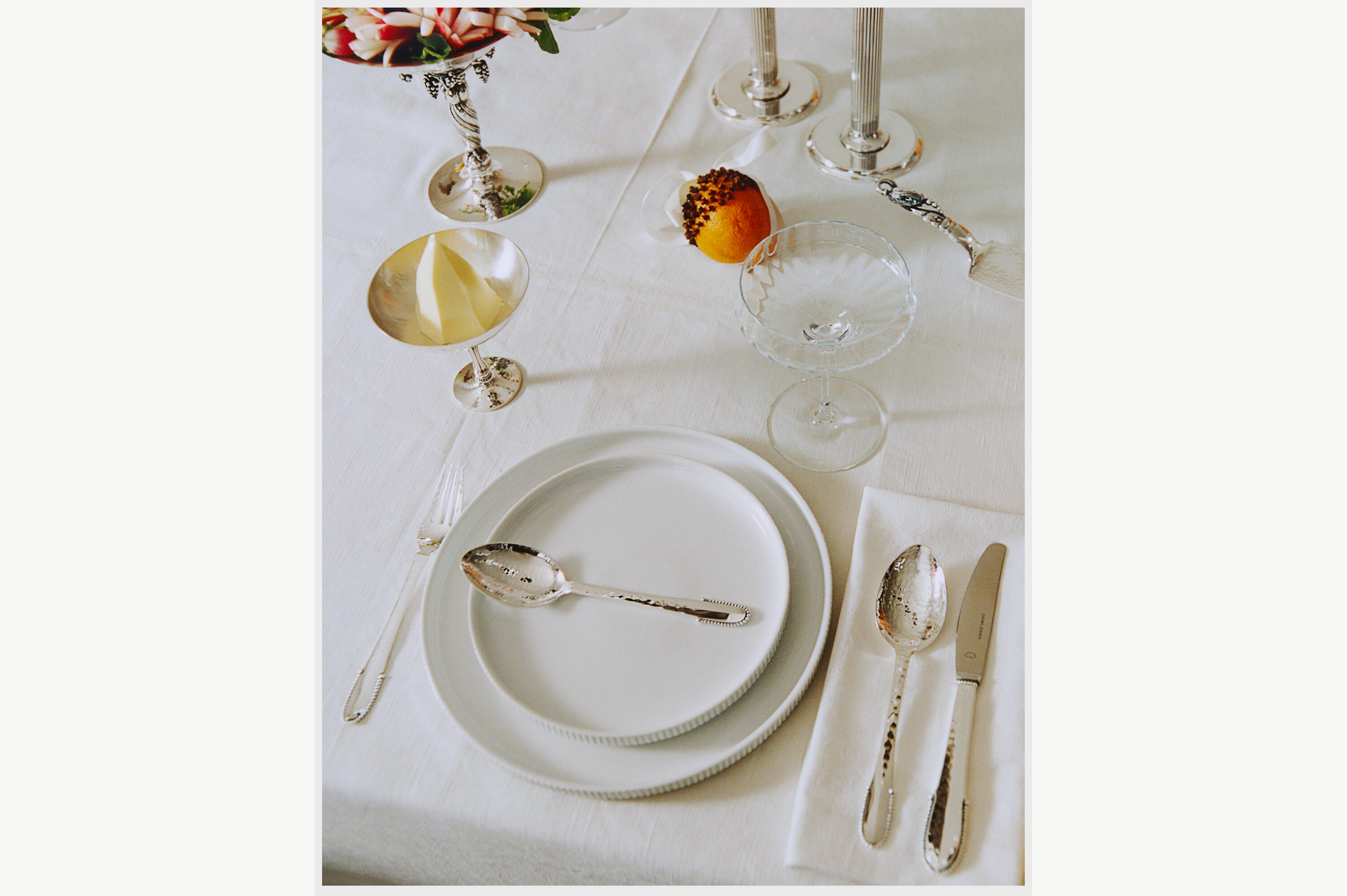 Είναι οι μικρές πινελιές που κάνουν τη διαφορά: τα ραπανάκια σκαλισμένα σε σχήμα λουλουδιών που τοποθετεί στο ασημένιο Bowl 1507 του Georg Jensen ή το εργαλείο από τα παιδικά της χρόνια που χρησιμοποιεί ακόμη για να χαράσσει μοτίβα σε πορτοκάλια. Μικρές στιγμές φροντίδας που μετατρέπουν ένα απλό τραπέζι σε μια εμπειρία γεμάτη ζεστασιά και τέχνη.